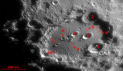 À l'intérieur de l'arène de Clavius, sur ce cliché, des détails de l'ordre d'un à deux kilomètres sont visibles, entre autre les chapelets de craterlets [3] et [4].