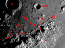 Parallèles au versant nord de Montes Apenninus, on peut voir Rima Bradley [6], une rainure rectiligne de 130 km de long et Rima Fresnel [7], un système de rainures s'étendant sur plus de 90 km.